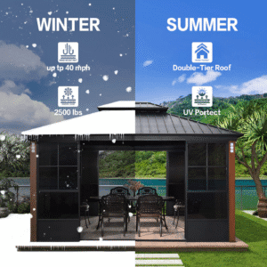 Perfect for relaxing, entertaining, or dining outdoors, this gazebo combines strength, elegance, and functionality. Its contemporary design blends seamlessly with a variety of outdoor decors, making it an ideal addition to your backyard, patio, or sunroom setup.