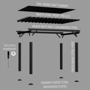 The 14×10 Stratford Traditional Steel Pergola with Sail Shade Soft Canopy is a durable and stylish outdoor structure designed to provide shade, comfort, and elegance for patios, gardens, decks, and backyard spaces. Combining a sturdy steel frame with a soft, adjustable sail shade canopy, this pergola offers both structural strength and flexible sun protection. Its contemporary design fits seamlessly into various outdoor settings, creating a functional and inviting space for relaxation, entertaining, or outdoor dining.