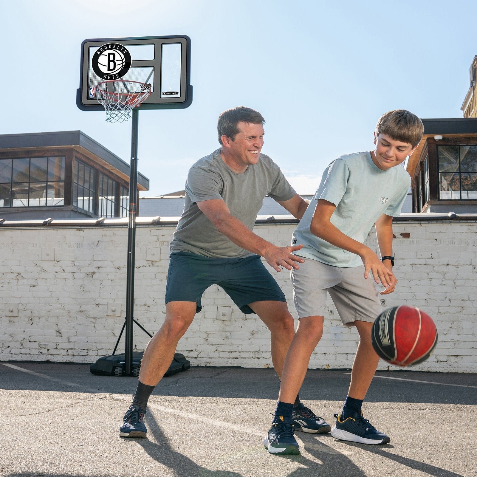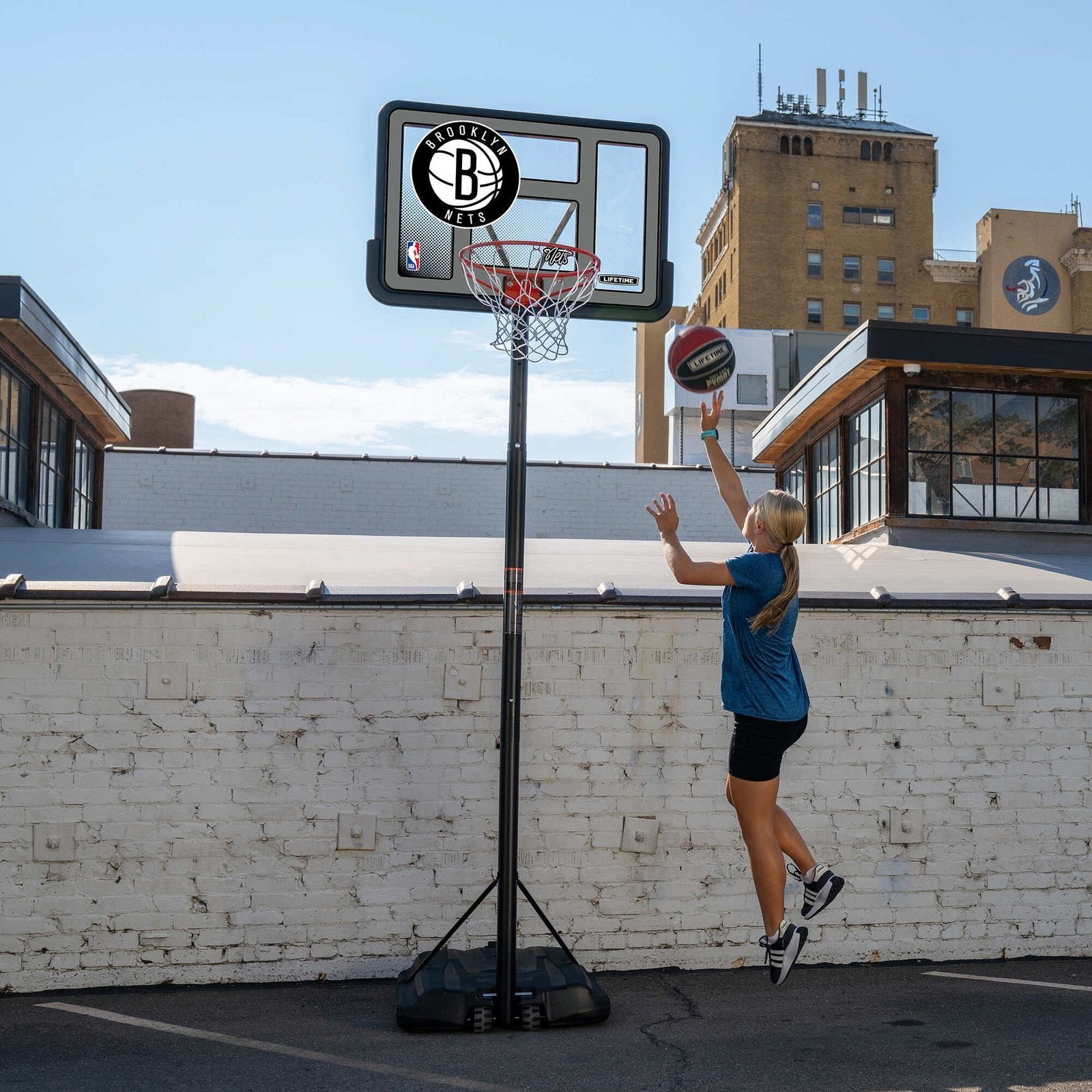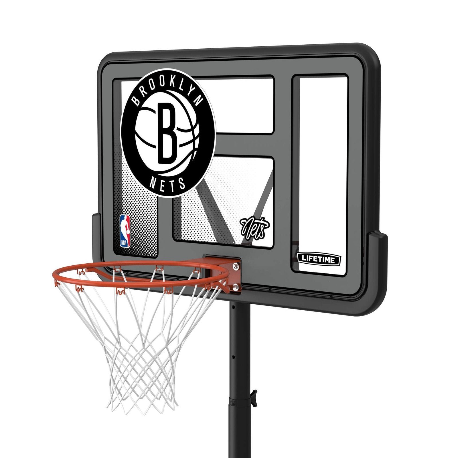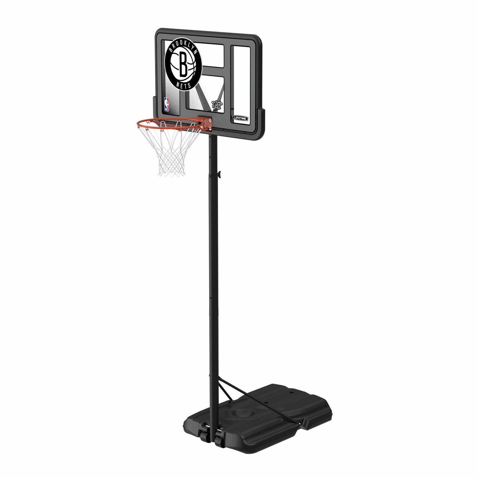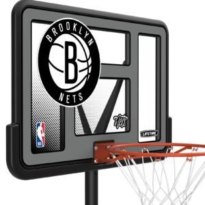 Bring the NBA to your home with the Lifetime 44-Inch Shatterproof Fusion Portable Basketball System. For the first time ever, you can own a full-size residential hoop decorated with graphics representing your favorite NBA team, all while trusting in the U.S.-made quality of Lifetime Products, the top name in residential basketball. Set the powder-coated steel Classic Rim to the height of your choice using the telescoping adjustment mechanism, and set up the hoop anywhere you want it using the fully portable, fully stable heavy-duty Pro Court base. A 2.75-inch round powder-coated steel pole and all-weather net ensure that your hoop stays strong through exposure to the elements. Play to your maximum potential on a 44-inch Shatterproof Fusion Backboard, the official backboard of the NBA. Enjoy the game of basketball at home while repping your favorite NBA team with the Lifetime 44-Inch Shatterproof Fusion Basketball System.