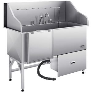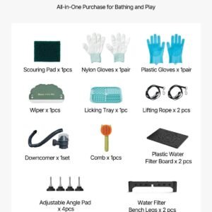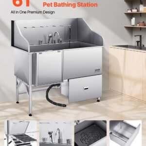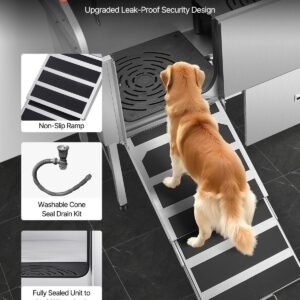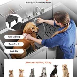 This professional dog grooming tub features an integrated design with hot and cold faucets, a dual-control showerhead, a 500 ml soap dispenser, and a PE non-slip water filter board for safe, efficient pet bathing. Its foldable ramp door doubles as a door panel, providing easy, slip-free entry and compact storage. The upgraded drainage and sealing system prevent leaks and odors, while the 304 stainless steel tub ensures long-term durability and corrosion resistance. Certified by CUPC and NSF, it supports pets up to 440 lbs (200 kg) and includes complete accessories such as a licking plate, brush, gloves, and a home hose connector for a full grooming experience.