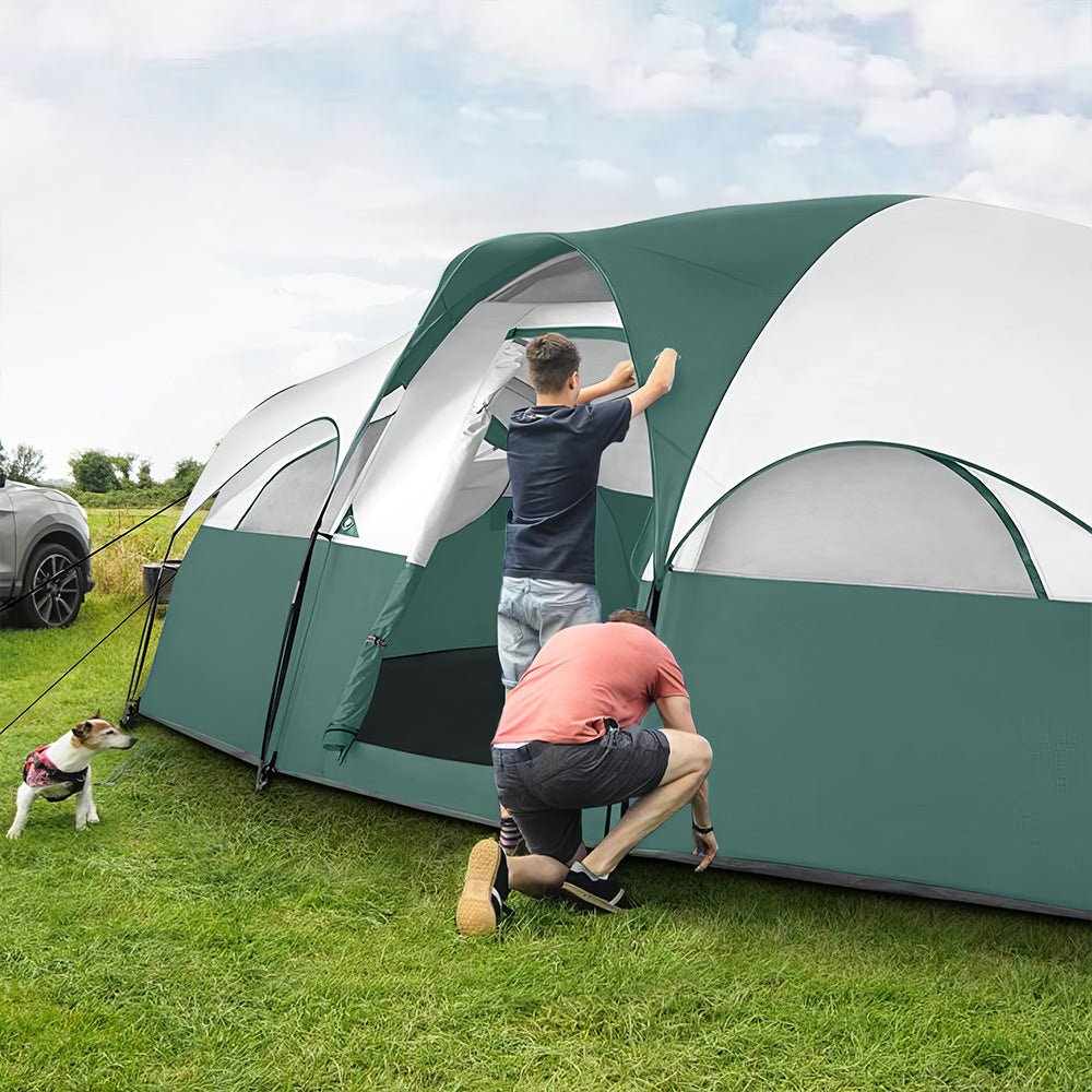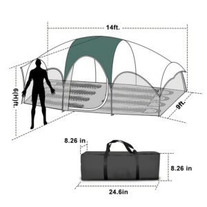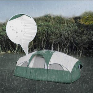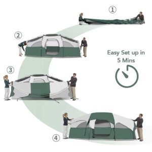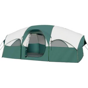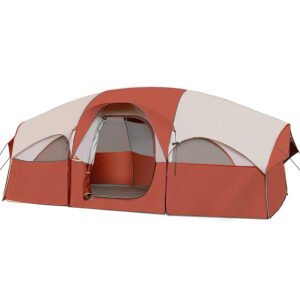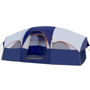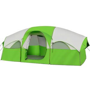 This 8 person camping tent features a spacious interior with straight walls and a 72-inch center height, offering plenty of standing and moving space. Designed for comfort and weather resistance, it includes a waterproof outer layer and sealed seams to keep you dry. With five large mesh windows and a mesh roof, this tent offers excellent ventilation and scenic views. A removable divider lets you create two separate rooms for added privacy or use it as a projector screen for nighttime entertainment. It’s easy to set up in minutes with color-coded poles and includes a carry bag for convenient transport.