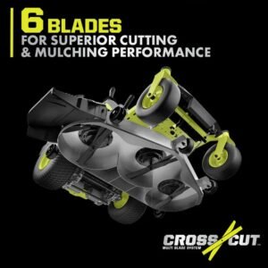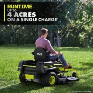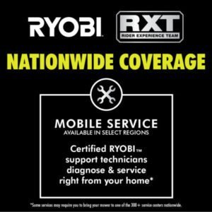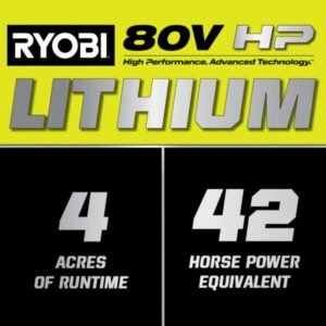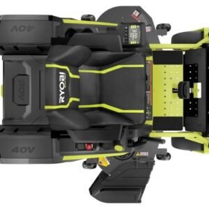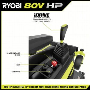 Introducing RYOBI’s first lithium-ion battery powered zero turn riding mower, the RYOBI 80V HP 54″ Lithium Electric ZTR*. HP Technology and 80V batteries combine to deliver the power equivalent of a 42 horsepower gas engine*, while eliminating the hassle and maintenance of a gas mower. This rider cuts up to 4 acres per charge with the help of 5 brushless motors, (3) 80V 10Ah batteries, and (4) 40V 12Ah batteries, with a Hyper Charger that fully recharges in 5 hours so you’re ready for your next job. The revolutionary iDrive system uses an intuitive one-handed joystick steering to maneuver around objects more easily than a traditional ZTR. The innovative LCD screen displays runtime, battery life, and cut/drive speed while in use, while the Riding Mower app allows you to monitor charge time and battery life remotely. This riding mower features the CROSS CUT multi blade system, providing superior cutting & mulching performance, while the 12-point height adjustment allows you to select the perfect cutting height between 1.5″ and 4.5″. The rubber side discharge chute makes it easy to maneuver around landscaping so users are not restricted by where they can cut. Designed with comfort and convenience in mind, this mower features premium seat suspension, 2 USB ports to charge phones, a storage compartment, and LED headlights. Mobile Service available in select regions. If your riding mower requires attention, a certified RYOBI support technician can diagnose & service right from your home. Some services may require you to bring your mower to one of the 300+ service centers nationwide. Lawn maintenance will never be the same thanks to the RYOBI 80V HP Brushless 54″ Lithium Electric Zero Turn Riding Mower.