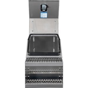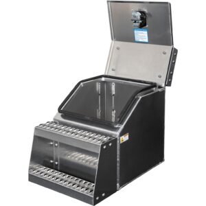 Buyers Products WideOpen Class 8 Step Boxes provide spacious, accessible storage for your semi truck. The lid of each box opens extra wide, allowing you to stow larger items and easily reach your tools and equipment. A universal design fits all major semi truck brands including Peterbilt®, Kenworth®, International®, Freightliner®, Western-Star®, Volvo®, and Mack®. The boxes feature .125 in. thick aluminum construction to handle life on the open road.