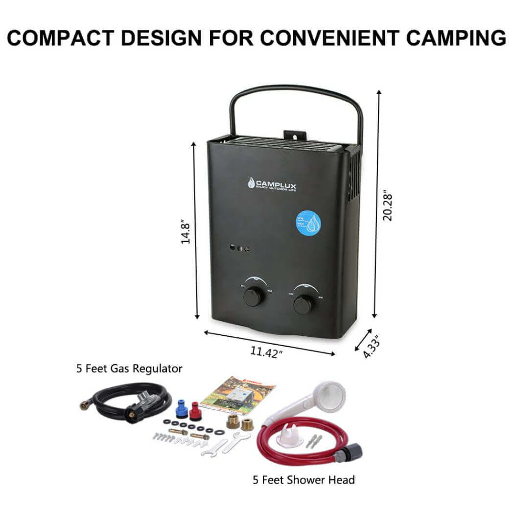 The Camplux Portable Propane Tankless Water Heater provides convenient hot water for camping, RV trips, outdoor showers, and pet washing. Designed with a lightweight portable build and easy carry handle, this unit weighs only 14 lbs, making it ideal for outdoor use.