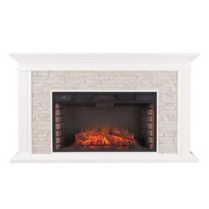 Add comfort and cozy to your home with this white electric fireplace with elegant faux stacked stone detail