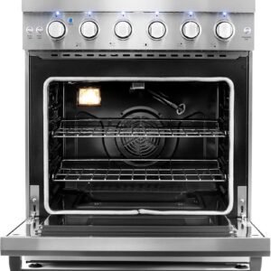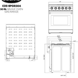 Cosmo’s COS-EPGR304 30 in. Gas Range brings high end styling and quality into your home kitchen. The large 4.5 cu. ft. oven capacity lets you bake for a crowd and the gas cooktop with 5 sealed burners can handle all your pots and pans with ease. The cooktop is equipped with a variety of different burners to suit needs from the largest pots and pans down to the most delicate sauces: 18,000 BTU, 9,000 BTU, 8,000 BTU, 6,000 BTU and 4,000 BTU. In the convection oven, powerful fans circulate air for fast, perfectly cooked meals every time. Our special oven functions give you the precision to create everything from juicy roasts to delicate desserts. Designed for durability, this 30 in. gas range is constructed with industrial, corrosion-resistant stainless steel. A removable backsplash means this range is suitable for either freestanding or slide-in installation. The Cosmo Haven Collection brings enhanced functionality and design, offering a well-rounded option for those looking for more convenience and style in an appliance.