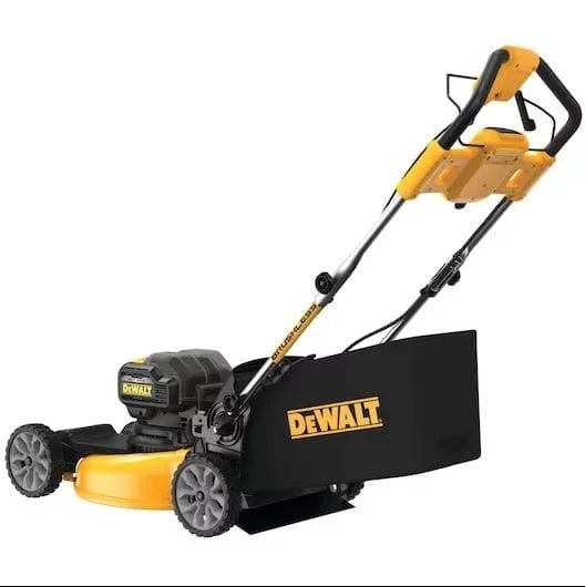 Featuring a brushless, direct drive motor that delivers up to 60 minutes of runtime in one charge This self-propelled lawn mower has the power you need to get the job done. Innovative, auto-sensing technology achieves higher rpm so you can cut thicker grass whether you are mulching, bagging, or using the side discharge. With a fold-over handle for convenient transport and integrated vertical storage, this cordless mower takes up 70% less space in your garage than it does when in operation. Count on the DeWalt FWD Self-Propelled Lawn Mower to deliver the power needed to tackle your lawn in comfort. Includes: (1) DCMWSP244 2X 20V MAX Self-Propelled Mower, (1) Collection Bag, (2) DCB210 10.0AH 20V MAX Battery, (2) DCB107 20V MAX 1.25 Amp Charger, (1) Safety Key, (1) Instruction Manual, and (1) Side Discharge Chute.
