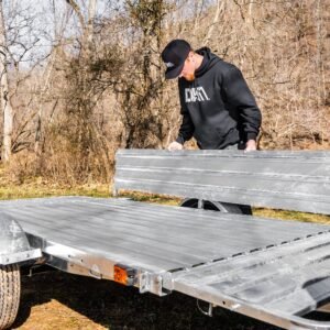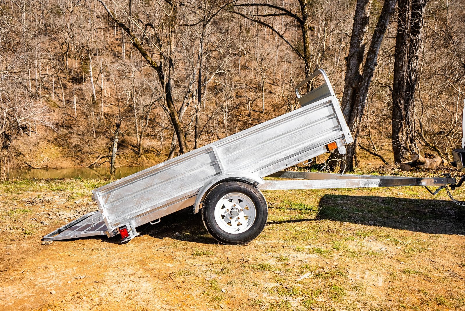 24 inch load-bearing corrugated steel drop gates that- when lowered- extends the trailer bed to 11 point 3 ft