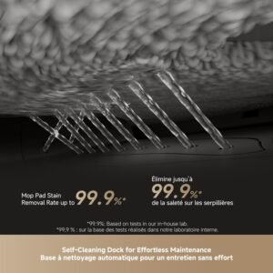 Edge-to-Corner Vacuuming and Mopping: Achieve thorough cleanliness of corners and tight spots with Dual Flex Arm technology. Its extendable side brush and mop aptly tackle different messes beneath low-profile furniture and in narrow spaces.