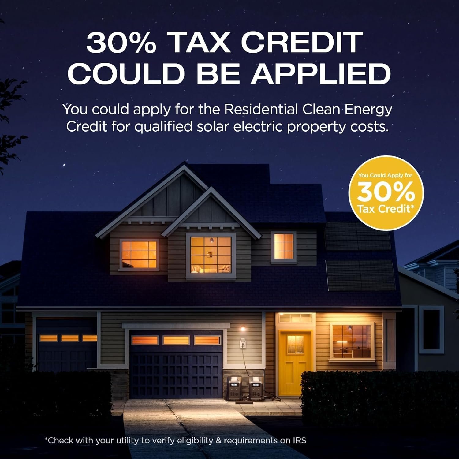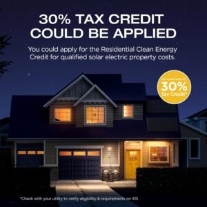 30% Tax Credit Could be Applied. You could apply for the Residential Clean Energy Credit for qualified solar electric property costs. Please check with your utility to verify eligibility & requirements for Residential Clean Energy Credit programs.