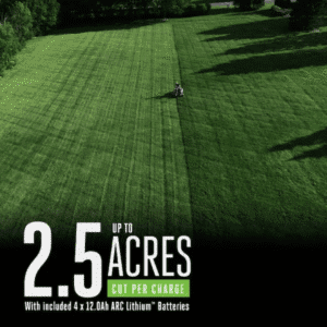 Up to 2 Acres Per Charge – With the included four 12Ah batteries, extendable with additional batteries.