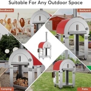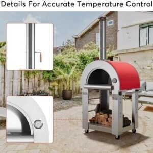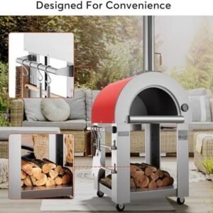 Portable Pizza Oven: With a focus on convenience and mobility, this pizza oven boasts a removable ash drawer, a bottom storage cabinet, and Accessories racks, offering a practical solution for storing cleaning supplies and cooking tools. Furthermore, it is equipped with 4-wheels, which turns the pizza oven outdoor into a portable oven so that you can move it into the garage when not in use