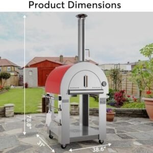 Dimensions:38.6 in. W x 31 in. D x 78.8 in. H; Cooking Area: 25 in x 30 in, meaning you can cook pizzas of up to 24 inches, Crafted from robust stainless steel #430 and has a strong stainless steel finish for a long-lasting oven