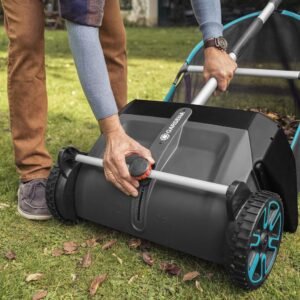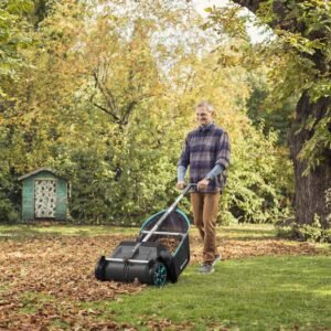 The Gardena leaf and grass collector – a clever solution for garden waste. Whether it’s fallen leaves or grass cuttings, the lawn sweeper from Gardena makes collecting them a breeze. The design of this manual sweeper means you can work cleanly while protecting your back. It is also silent and environmentally friendly – all with no motor involved. The height adjustment feature lets you adjust the working height to different surfaces. The integrated collecting container can be effortlessly removed for emptying of collected leaves.