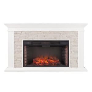 Western romanticism warms to life in this striking electric fireplace. Crisp white finish, subtle woodwork and rustic white simulated stacked stone encases the firebox. Extra wide fireplace ignites the senses; cozy heat fills great rooms and reading nooks alike, wowing any crowd. Conjure the ambience of a blazing hearth in an entertaining parlor, living room or dining area with this stunning, traditional fireplace. Energy efficient LED bulbs light the fire, a cost effective way to ignite bliss in any room without professional installation. User friendly remote control offers 4-way adjustability to customize the widescreen fireplace from the comfort of your sofa. Flames and logs harmonize with 5-level adjustment, plus optional down light illumination. An automatic shutoff and glass that remains cool to the touch ensure the fireplace warms safely. Turn off the heat to enjoy the fireplace ambience year round.