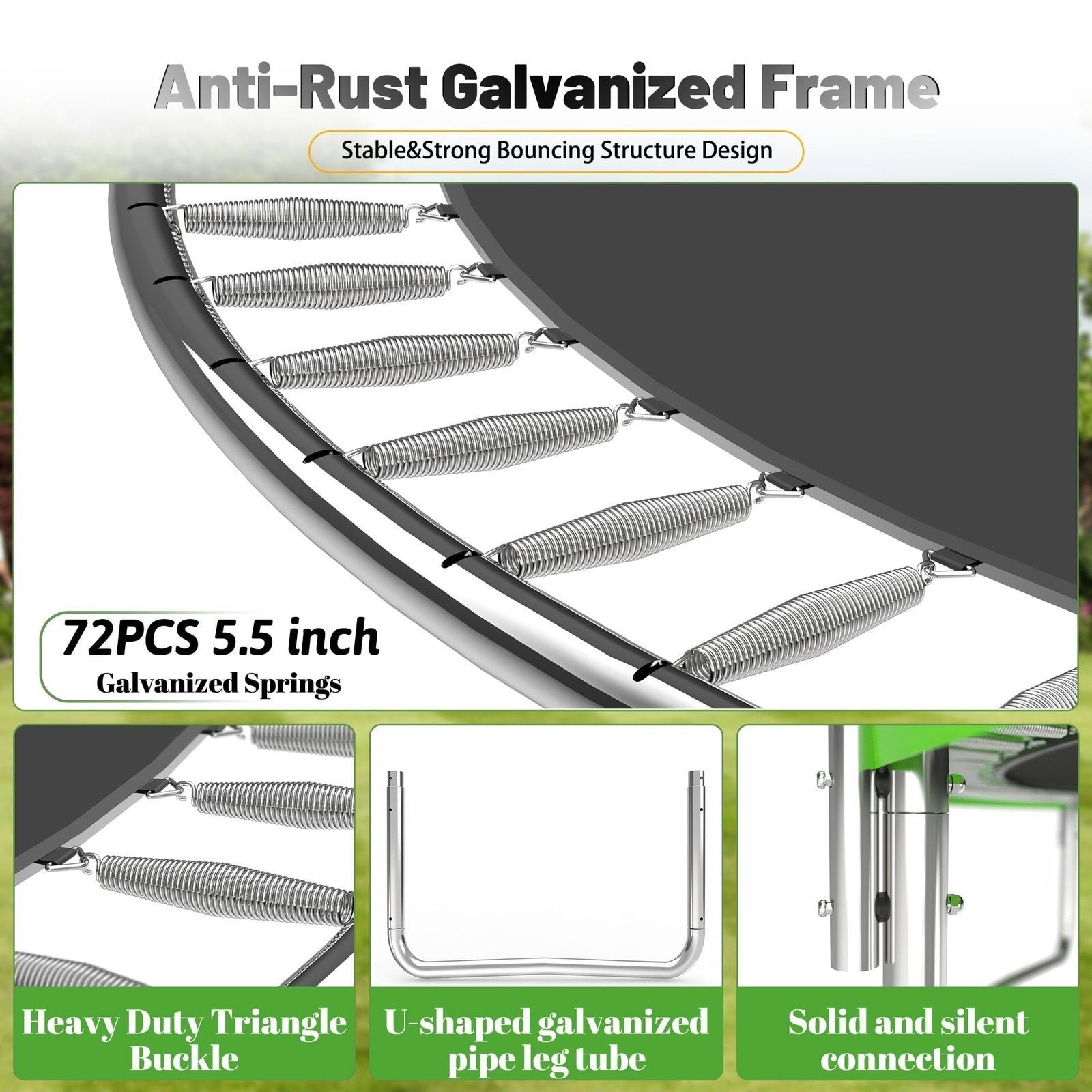 【Safety 12Ft Trampoline】Mersco 1320 lbs load-bearing 12ft trampoline, adopts 1.2mm fully galvanized steel frame, 5.5in long galvanized springs, can accommodate 5-7 children, and meets advanced international component, assembly and usage standards. In addition, the 72-inch high-density PE safety net is UV-resistant, waterproof and tear-resistant. Double zipper and buckle closure system ensures the safety of users when jumping.Note: Single-person weight limit is 330 lbs.