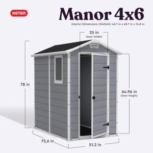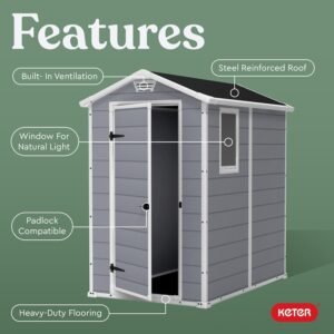 Lawn mower, garden tools, extra hoses, fertilizer bags and those leftover bricks from your patio project… what do all of these items have in common? They’re all cluttering up your basement or your garage and you’re tired of dragging them out into the yard every time you need to use them. The solution to your problem just might be the Manor 4 x 6 outdoor storage shed from Keter Plastic. This tough plastic shed won’t ever rot, peel or dent, unlike its wooden and metal competitors. Furthermore, the double door at the front of the shed makes it easy to get big items in and out of the shed without strain or hassle.