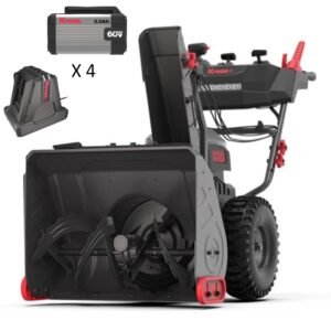 Powered by four 60V 5.0Ah lithium-ion batteries, it offers long-lasting performance and extended runtime. The high-torque brushless motor drives a durable 24-inch steel auger and impeller system, easily tackling snow up to 21 inches deep. The dual-stage design breaks up packed snow and throws it far from your clearing path.