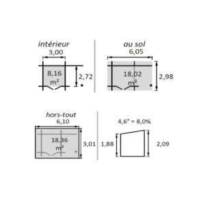 Interior height: from 1.88 m (front) to 2.09 m (rear) with a 4.6° roof slope, providing a comfortable and airy space.