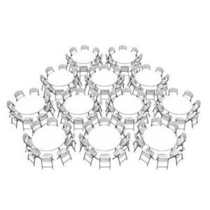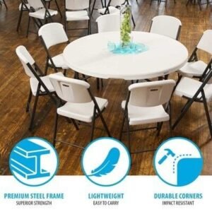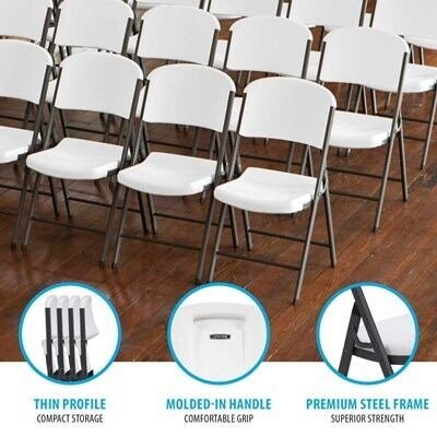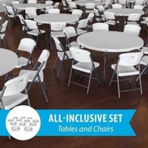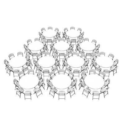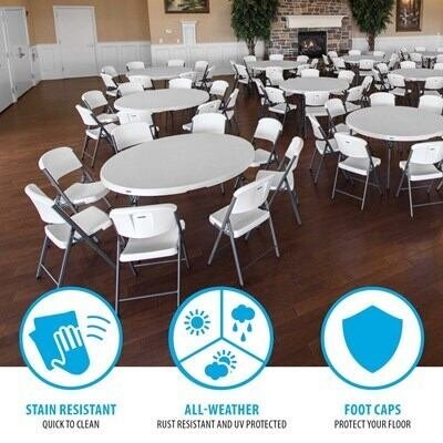 Lifetime combo sets match table and chair models that are known to pair well together. Lifetime 60-Inch Round Commercial Folding Tables are constructed of high-density polyethylene and are stronger, lighter and more durable than wood. The innovative nesting design lets multiple table stack together for space saving storage. They will not crack, chip or peel, and are built for indoor and outdoor use. The patented steel frame design provides a sturdy foundation and is protected with a powder-coated, weather-resistant finish. Perfect for banquets, meetings or events, Lifetime 60-Inch Round Folding Tables are built for the rigors of demanding commercial use and exceed challenging BIFMA standards. Lifetime Commercial Folding Chairs are made of high-impact polyethylene, contoured for comfort, and designed for durability. Powder-coated High Strength Low Alloy (HSLA) steel creates a lighter chair with increased strength and stability. Lifetime Folding Chairs are lightweight, easy to clean and can be used indoor or out. The chairs exceeds demanding BIFMA standards and are perfect for your next meeting, event or family gathering.