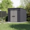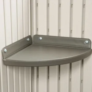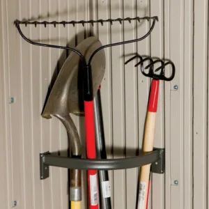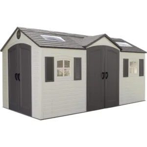 This sturdy high-density polyethylene storage shed comes in an attractive design, featuring 2 double-door entryways and a slant-styled roof. Inside is plenty of storage features for garden tools and outdoor supplies, including peg strips and four corner shelves. The extra-large 15′ x 8′ space allows ample room for heavier items such as lawnmowers, while the exterior provides protection from rain, snow and UV damage.