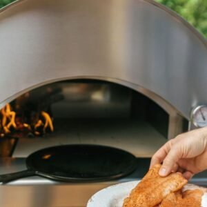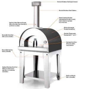 The oven features a solid welded bent-steel dome engineered for all weather conditions, ensuring durability and longevity. The exterior of the oven is safe to touch when in use, as it is fully insulated with rock wool for efficient heat retention. The unique cooking chamber design provides even heat distribution, avoiding hot spots and ensuring perfectly cooked meals every time.