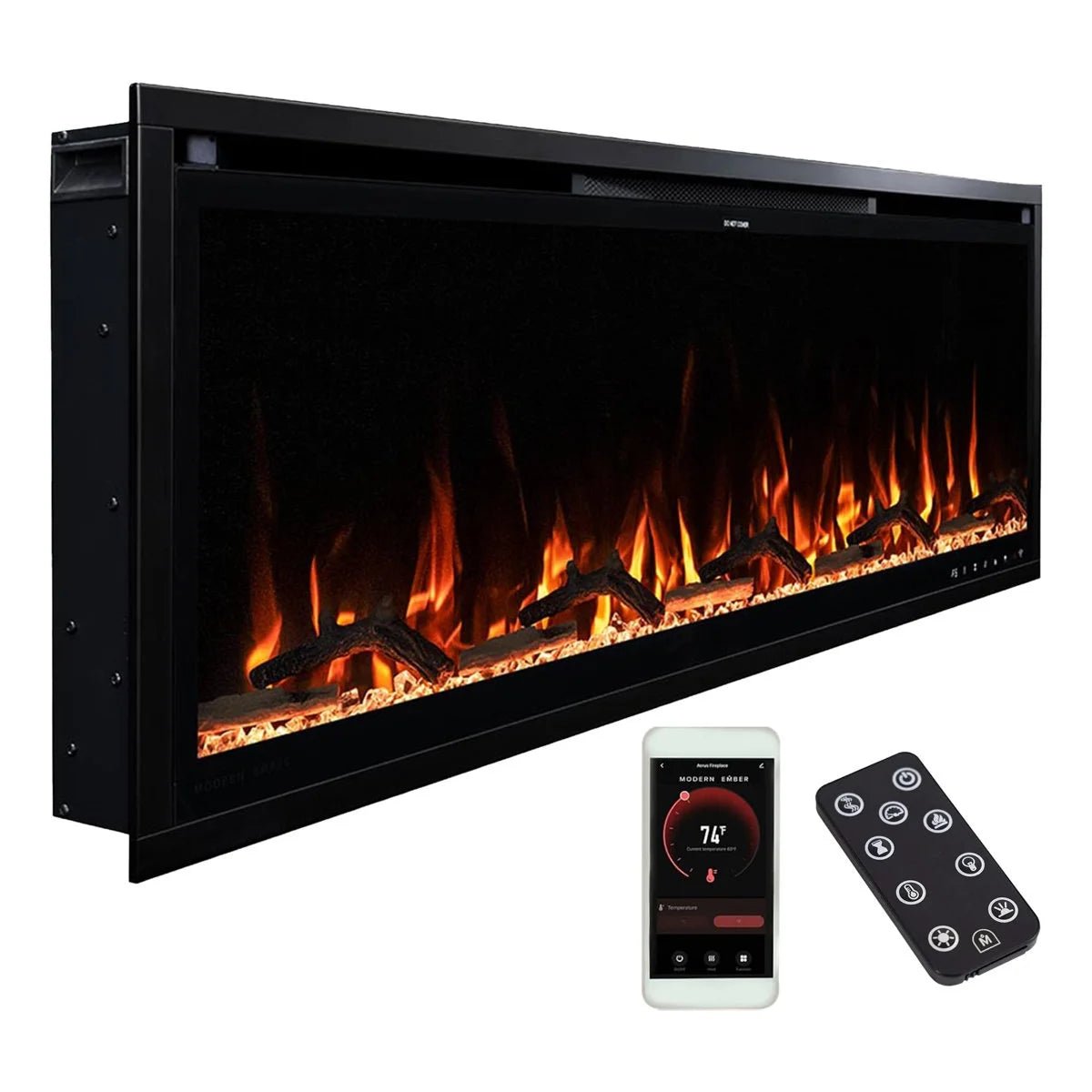 Infuse your home with modern elegance with the Aerus Smart Linear Electric Fireplace, designed for effortless installation in 2×6 walls or wall bump-outs. Whether mounted on the wall or fully recessed, this minimalist fireplace creates a bold focal point, enhancing both modern and transitional interiors. Customize your ambiance with five LED flame colors, three flame speeds, and five brightness levels, paired with ten ember bed colors to suit your mood. Enjoy the flexibility of using the fireplace with or without heat, creating a warm and inviting atmosphere all year round. With WiFi-enabled smart controls, adjust the settings remotely via the mobile app, Alexa, Google Home, or the included remote for ultimate convenience. The 5000 BTU thermostatic heater offers supplemental warmth for up to 400 sq. ft., with precise temperature control from 68°F to 88°F. For added peace of mind, the built-in timer allows for automatic shutoff. Complete with a driftwood log set and clear crystals, this fireplace elevates any space with its sleek, contemporary design. Plus, flexible plug-in or hardwired installation options make setup quick and easy.