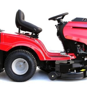 Operator comfort is a key focus of the design. The mower features a high-back, sprung seat that absorbs shocks from uneven surfaces, large pneumatic tires for smooth traction and stability, and an ergonomic steering wheel with soft-grip handles for fatigue-free operation. A protective front bumper and sturdy steel frame enhance durability while safeguarding the mower from impacts. The hydrostatic drive system ensures effortless control, making extended mowing sessions more manageable and enjoyable.