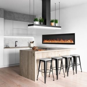 The black, nearly frameless finish surrounding this modern, linear, electric fireplace creates a minimalist look that doesn’t interfere with your décor, enhancing the fire aspect of the fireplace
