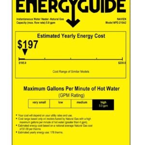The NPE-210A2 is a high efficiency tankless unit with 180,000 BTU/hr that can provide and endless supply of hot water.  The 210A2 has a flow rate of 7.8 GPM at a 45 degree temperature rise and is equipped with built in recirculating technology. Navien units are efficient and reliable making them a fantastic choice as an upgrade for all your hot water needs.