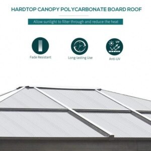 The polycarbonate roof is designed to block harmful UV rays while allowing natural light to filter through, creating a comfortable and inviting outdoor environment. The aluminum frame is lightweight yet robust, resistant to rust and corrosion, and requires minimal maintenance. Perfect for homeowners looking for a low-maintenance, durable, and visually appealing outdoor shelter, this gazebo enhances the usability and beauty of any outdoor space.
