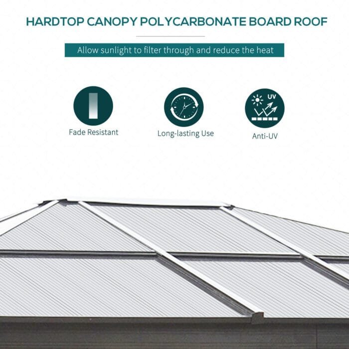 Material: Powder-coated aluminum frame, UV-resistant polycarbonate roof