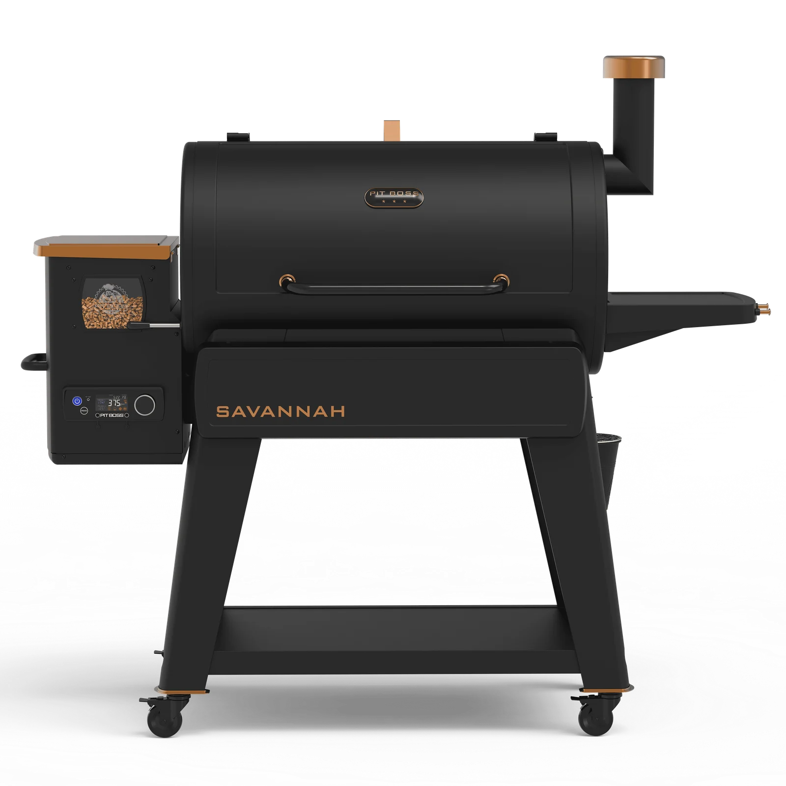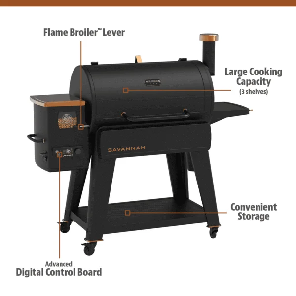 Bring the best to your backyard with the Pit Boss® Savannah 1500 Onyx Edition. This all-new wood pellet grill is outfitted with industry leading technology and a sleek design, making it more than qualified to be the centerpiece of your backyard cooking arrangement. With more than 1500 square inches of 3-tiered cooking space, you can easily host a crowd or serve up dinner for two. The Pit Boss Savannah’s advanced PID control board with P Settings allows for the ultimate controlled cooking experience. These settings allow you to adjust the machine to fit your environment or boost smoke density. The control board also features 5-degree increment settings to target indirect cooking temperatures ranging from 180 to 500°F. Or you can slide over the Flame Broiler™ lever for direct flame searing. All that power and innovation is packed into a sleek design with a matte black finish, backed by the Pit Boss best-in-class 5-year warranty.