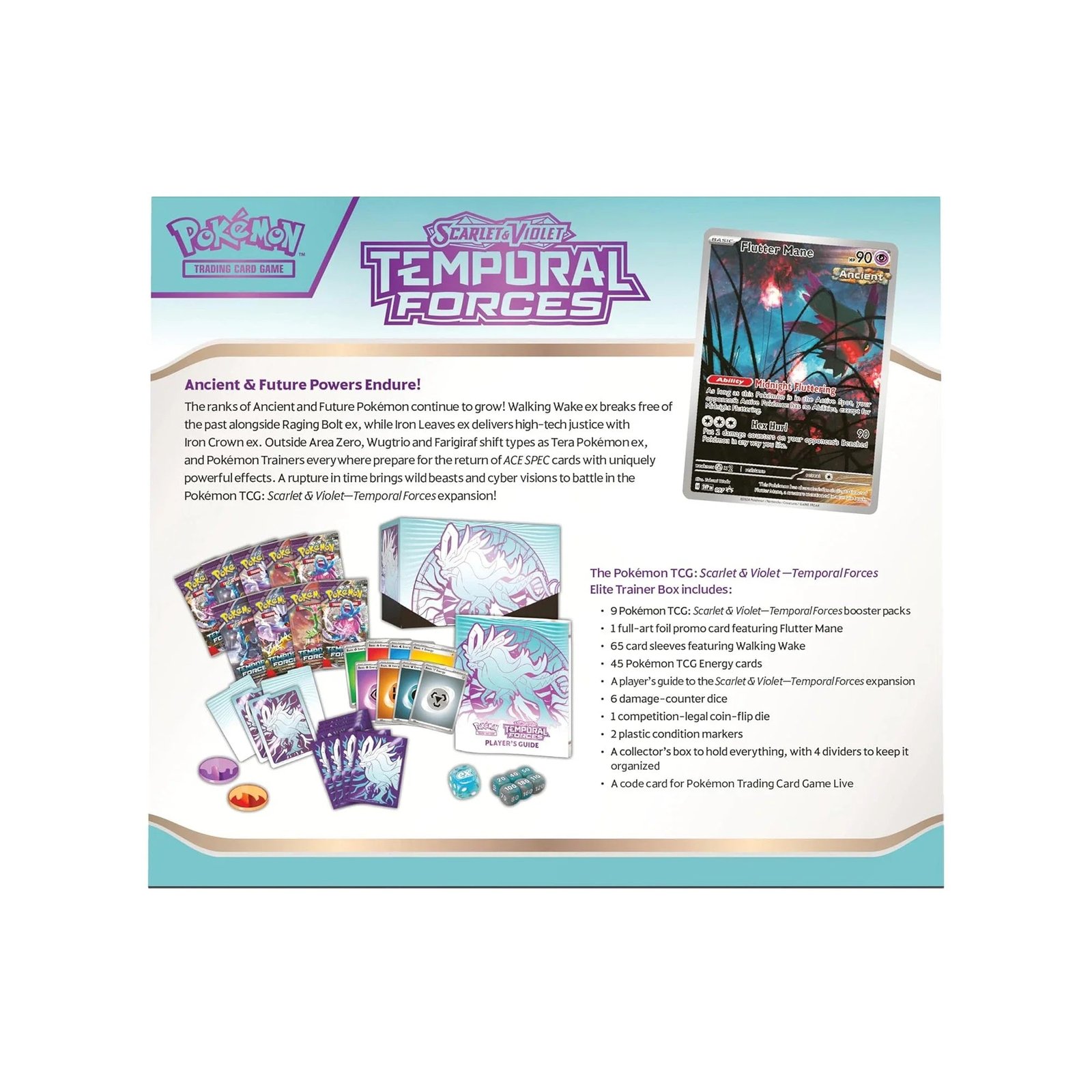 Inside, trainers will find everything needed to dive into the Temporal Forces set, including 9 booster packs, 65 card sleeves featuring Walking Wake, 45 Energy cards, 6 damage-counter dice, 1 competition-legal coin-flip die, and 2 condition markers—all encased in a collectible storage box with dividers. A Player’s Guide and code card for Pokémon TCG Live are also included, providing both newcomers and veterans with insight into deck-building and strategy refinement.