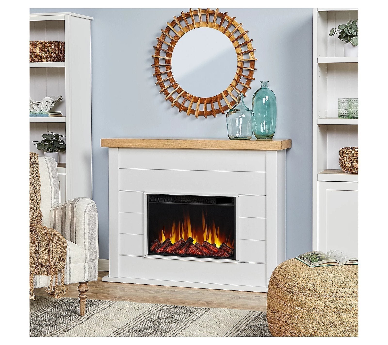 Welcome your guests with the warmth and allure of this electric fireplace boasting adjustable colors and heat to suit your setting. From Real Flame.