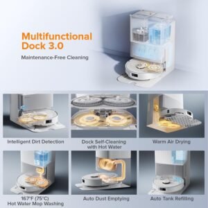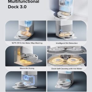 - Master-Class Maintenance-Free Experience: All-in-One Multifunctional Dock 3.0 with hot water. Up to 167℉, hot water mop washing and self-cleaning bring cleaning to the next level, easily getting rid of stubborn stains and maintaining a spotless home environment. A dust bag as large as 2.7L supports over 60 days of hassle-free cleaning.