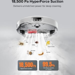 - Unmatched Cleaning Power: With up to 18,500 Pa strong suction, it easily overcomes all cleaning challenges, powerfully lifting hair, debris, dust, and dirt from carpets and hard floors into the dustbin.