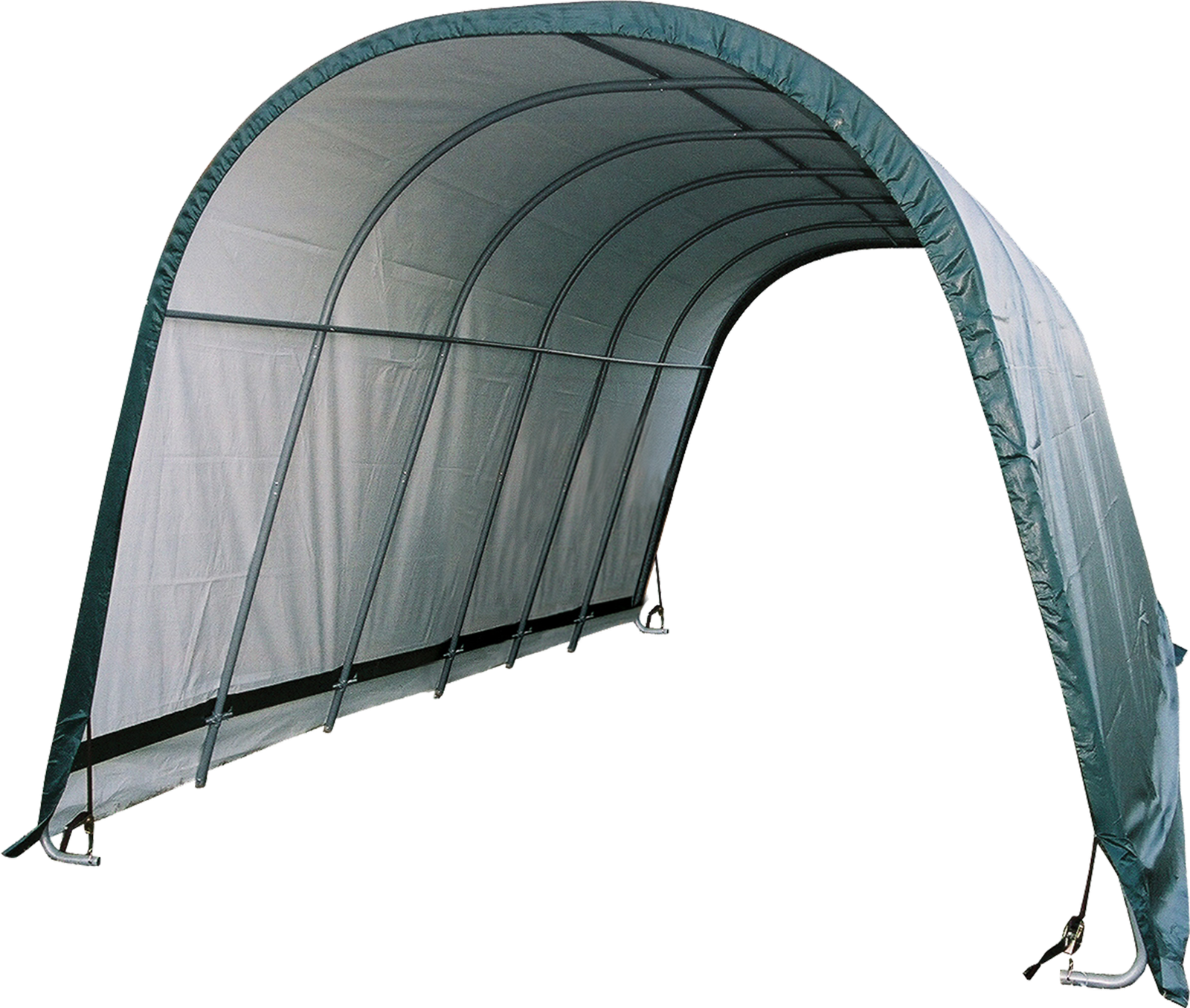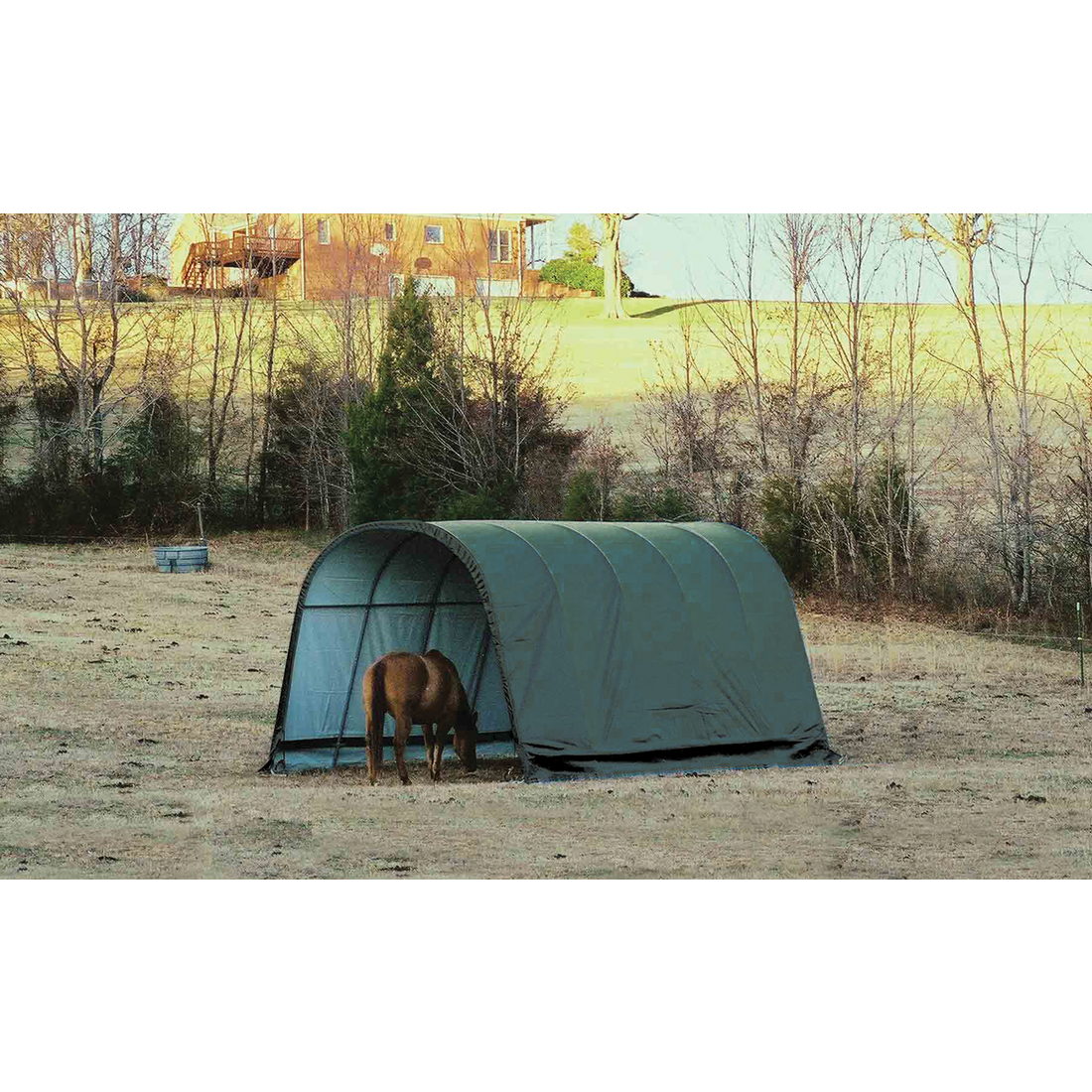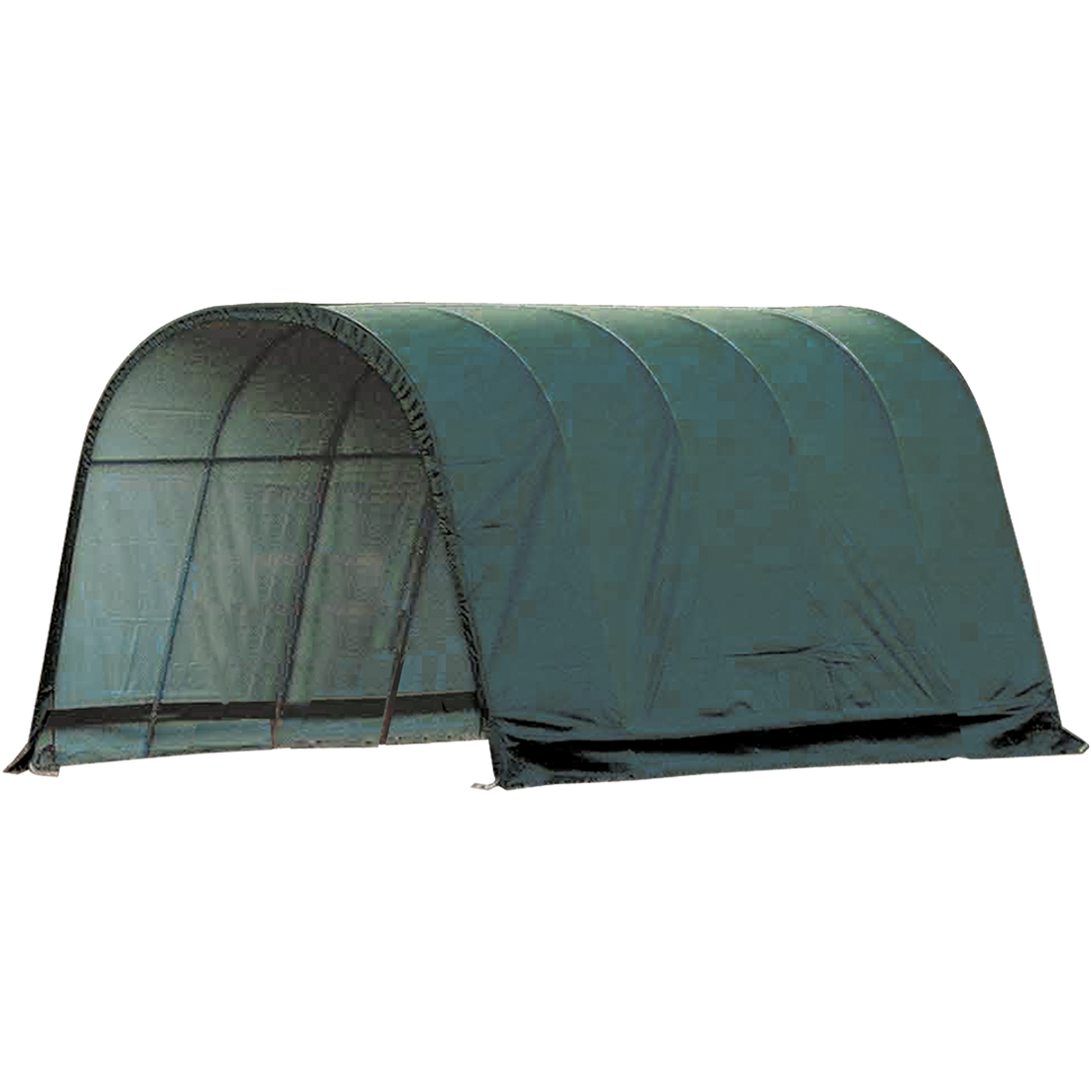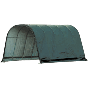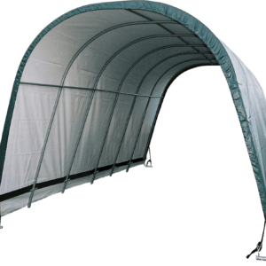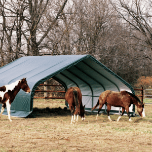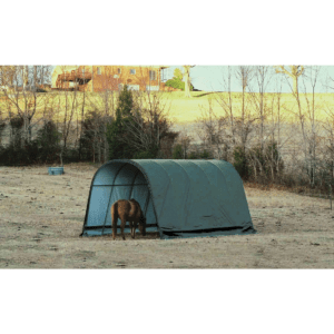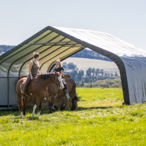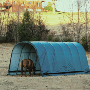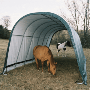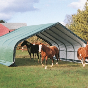 Contact UsCustomer ServiceMy AccountShipping and ReturnsTrack OrdersParts RequestSAGE / PPAI InquiriesProduct RecallWarranty ClaimProduct Registration | Specifically designed for equine and livestock, the equine run-In-shed is constructed using high grade heat treated steel that goes through a proprietary 13-step Rhino Shield steel surface preparation process | Professional grade 1-5/8 in. / 4,1 cm all steel frame, bonded with thermoset baked on powder-coated finish prevents chipping, peeling, rust and corrosion | Advanced engineered, 3-layer, polyethylene, ripstop fabric cover with hot air fused seams that are 100% waterproof, UV-treated inside and out with added fade blockers, anti-aging, antifungal agents, high profile white interior lining provides enhanced illumination | Slip fit connectors and swedged tubing make for easy assembly, bolt hardware at every connection ensures a solid structure | Ratchet Tite tensioning enables quick cover installation, Easy Slide Cross Rail system locks down and squares up frames