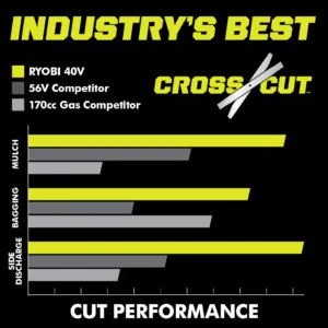 The RYOBI 40V HP Brushless 21” Self-Propelled All-Wheel Drive Multi-Blade Mower delivers more power than a 170cc gas mower, making it a true gas replacement. It’s ideal for up to ¾ acre with dual active battery ports and runs for up to 70 minutes with the included (2) 40V 6Ah batteries. Experience the industry’s best 3-in-1 cutting performance with the CROSS CUT™ Multi-Blade System. This allows for less clumping when mulching, further & more even dispersal when side discharging, and when bagging the fine clippings fill from back to front to maximize space for less bag changes. The brushless motor and advanced electronics automatically react to mowing conditions by increasing the blade speed to eliminate bogging down and powering through the toughest cut. As part of WHISPER SERIES™, this mower is 85% quieter than gas, and even quieter than other cordless mowers, allowing you to mow at any time of day. The all-wheel drive system gives you ultimate maneuverability and control in any terrain by providing full power to all four wheels, while SMART TREK™ self-propelled technology allows you to easily adapt the mower’s speed to your pace for less fatigue. When the job is done, the handles quickly and easily collapse for compact, vertical storage. Best of all, it is part of the 40V System – any 40V battery works with any 40V product. This 40V HP Brushless 21” AWD Mower is backed by the 5-year manufacturer’s tool warranty and 3-year manufacturer’s battery warranty.