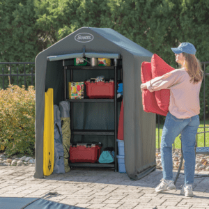 The Scotts Garden Shed is the perfect small storage solution for a patio, deck, or side of a house. The shed can be assembled in less than 30 minutes and offers optimal small space storage. The shed frame is constructed with 1-inch powder-coated carbon steel pipes and has a durable UV-treated 300D polyester cover. It can be used to store garden tools, pool supplies, and anything else you want to keep out of sight.