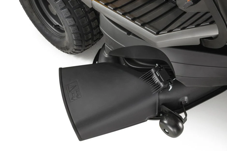 This tractor’s cutting deck is wide — approximately 108 cm — with two blades, allowing large widths of turf to be mowed in fewer passes. The deck is reinforced, robust and engineered for heavy duty mowing. The height of cut is adjustable (for example from ~30 mm to ~90 mm in 7 positions) so you can tailor the finish depending on season, turf type or aesthetic preference. The machine is designed with a “two‑in‑one” mowing capability: you can choose side‑discharge for rougher grass or less frequent mowing, or mulching for a finer finish and returning nutrients to the turf.