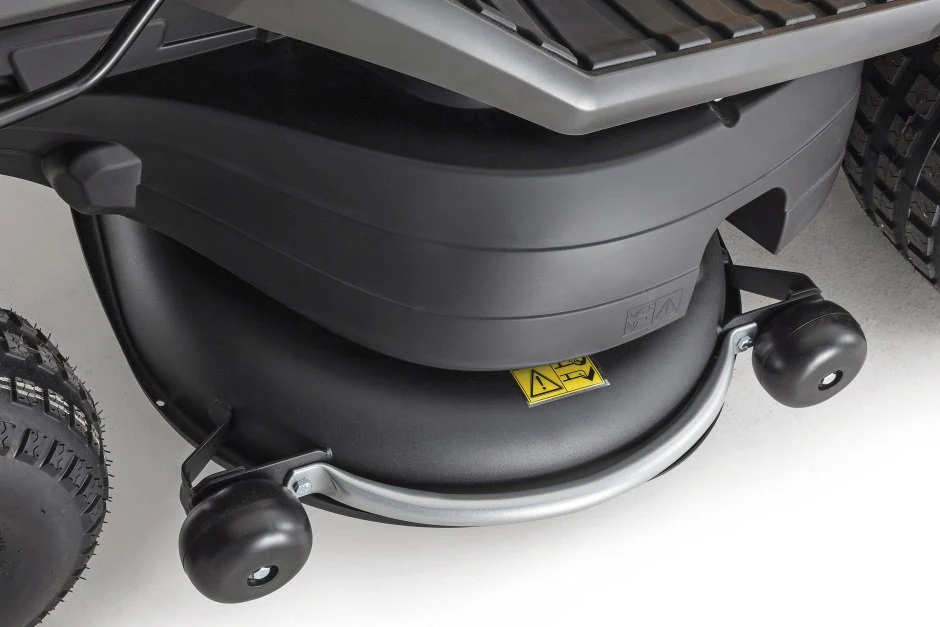 Anti‑scalp wheels under deck to protect turf and deck on uneven ground.