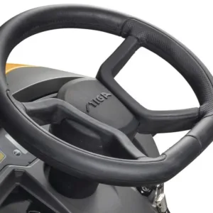 The Tornado 7108 W also delivers on operator comfort and accessories: it includes a premium steering wheel with soft grip, an adjustable seat (sometimes Comfort Plus), large rear wheels for traction, LED headlights for early or late mowing sessions, a robust cast‑iron front axle, anti‑scalp wheels to protect the deck when mowing uneven surfaces, and washing link/port for cleaning out debris from beneath the deck. In addition, cup‑holder, storage compartment and other practical features enhance the user experience.