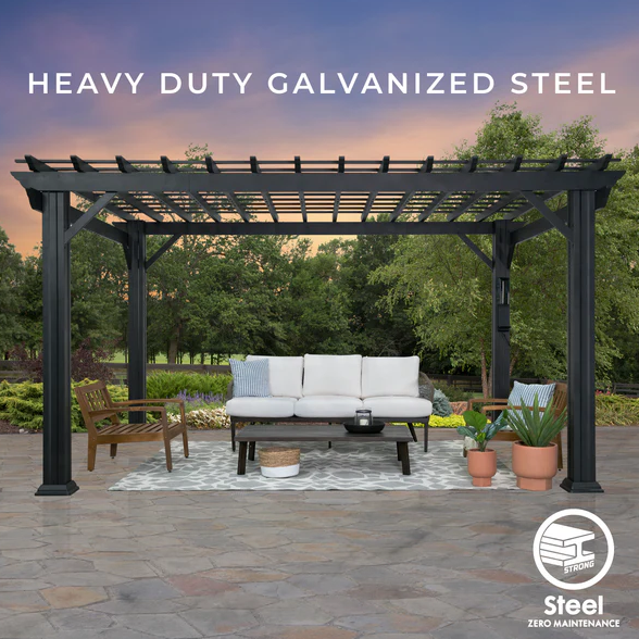 The Stratford 14′ × 10′ Black Steel Traditional Pergola with Sail Shade Soft Canopy is a perfect combination of style, durability, and practicality. Its spacious layout, protective canopy, and elegant steel design make it ideal for creating an inviting outdoor space for dining, entertaining, or relaxing. Designed for low maintenance and long-term performance, this pergola enhances the beauty and functionality of any backyard or patio, providing a comfortable and sophisticated outdoor living area.