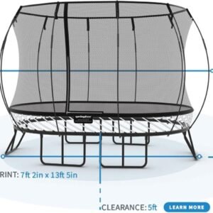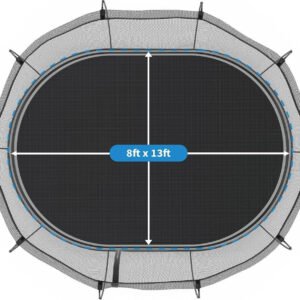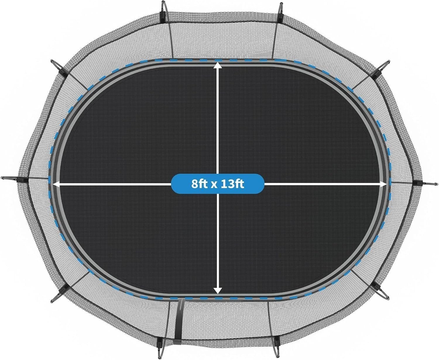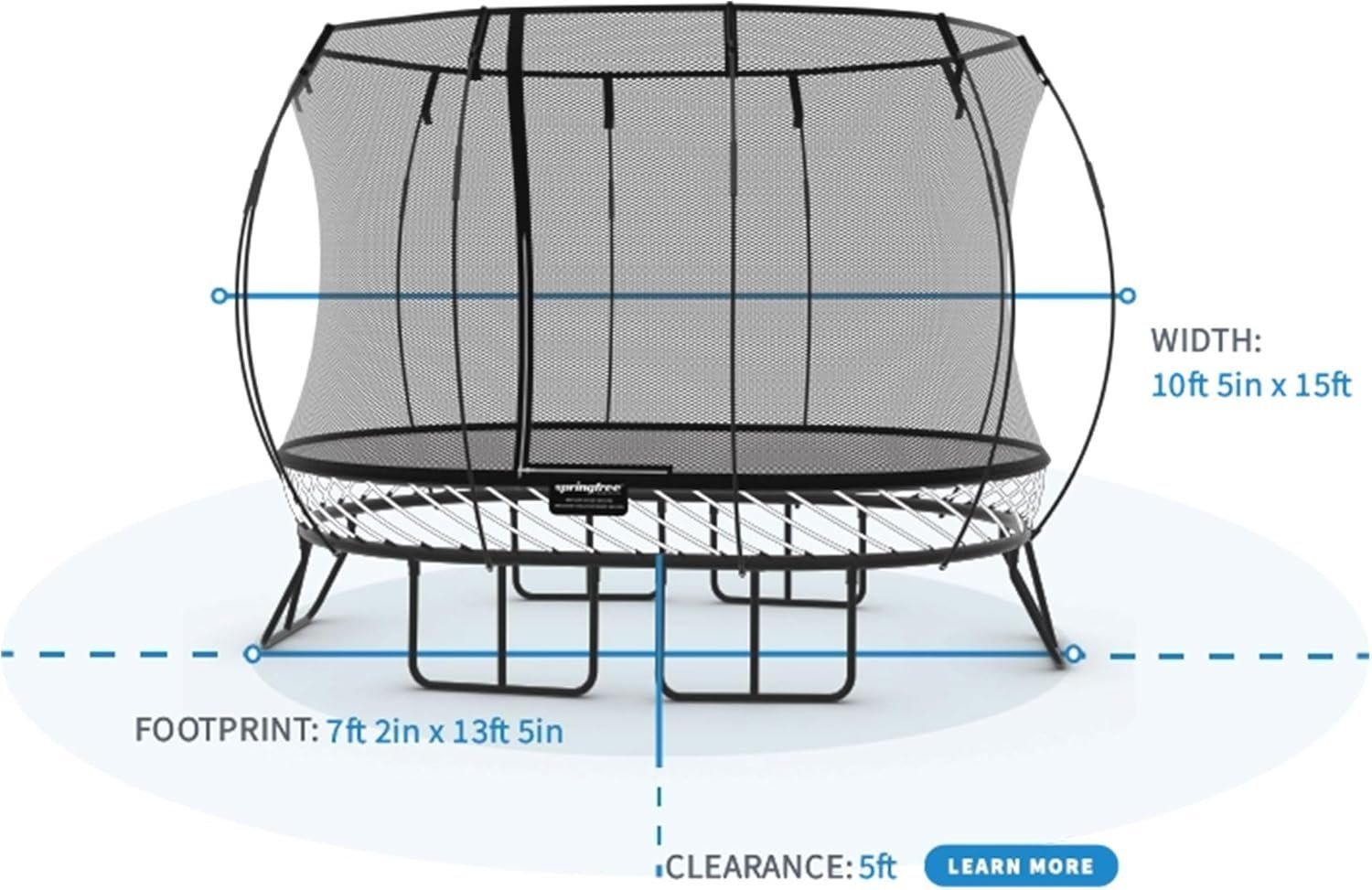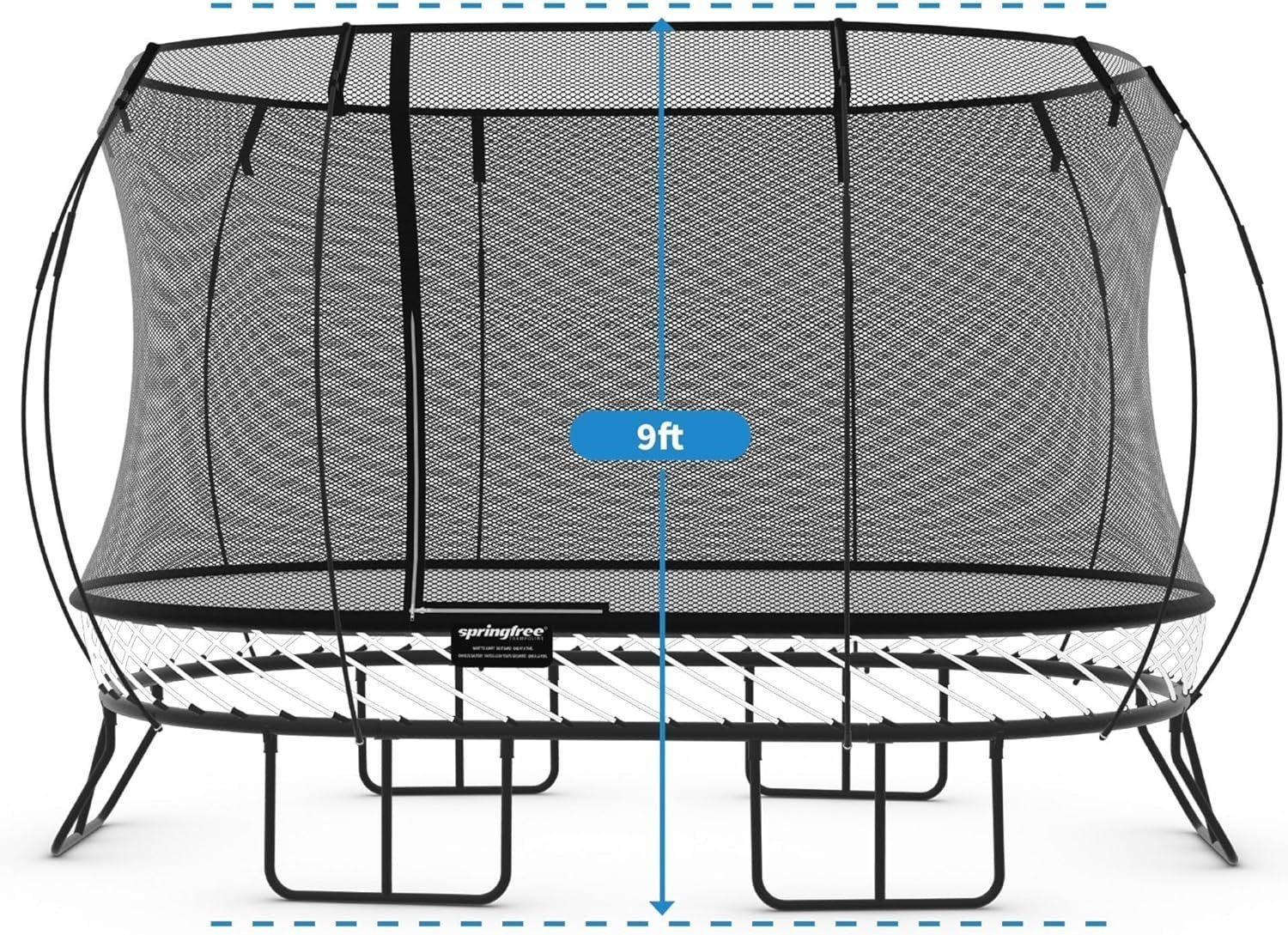 The Springfree Trampoline 8′ x 13′ Large Oval Trampoline with Safety Enclosure creates a safe outdoor play space for the entire family. This springless trampoline features a high-strength flexible frame with flexible composite rods, SoftEdge Mat for optimal shock absorption, and FlexiNet Enclosure for maximum cushion and safety. By eliminating springs, exposed frame, and steel poles, the Springfree Trampoline makes it safer for your kids to play.