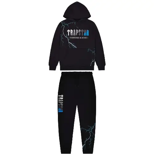 - Design: An all-black tracksuit set (hoodie and joggers) with high-impact dazzling blue chenille branding and scattered white/blue lightning bolt designs for a dynamic look.